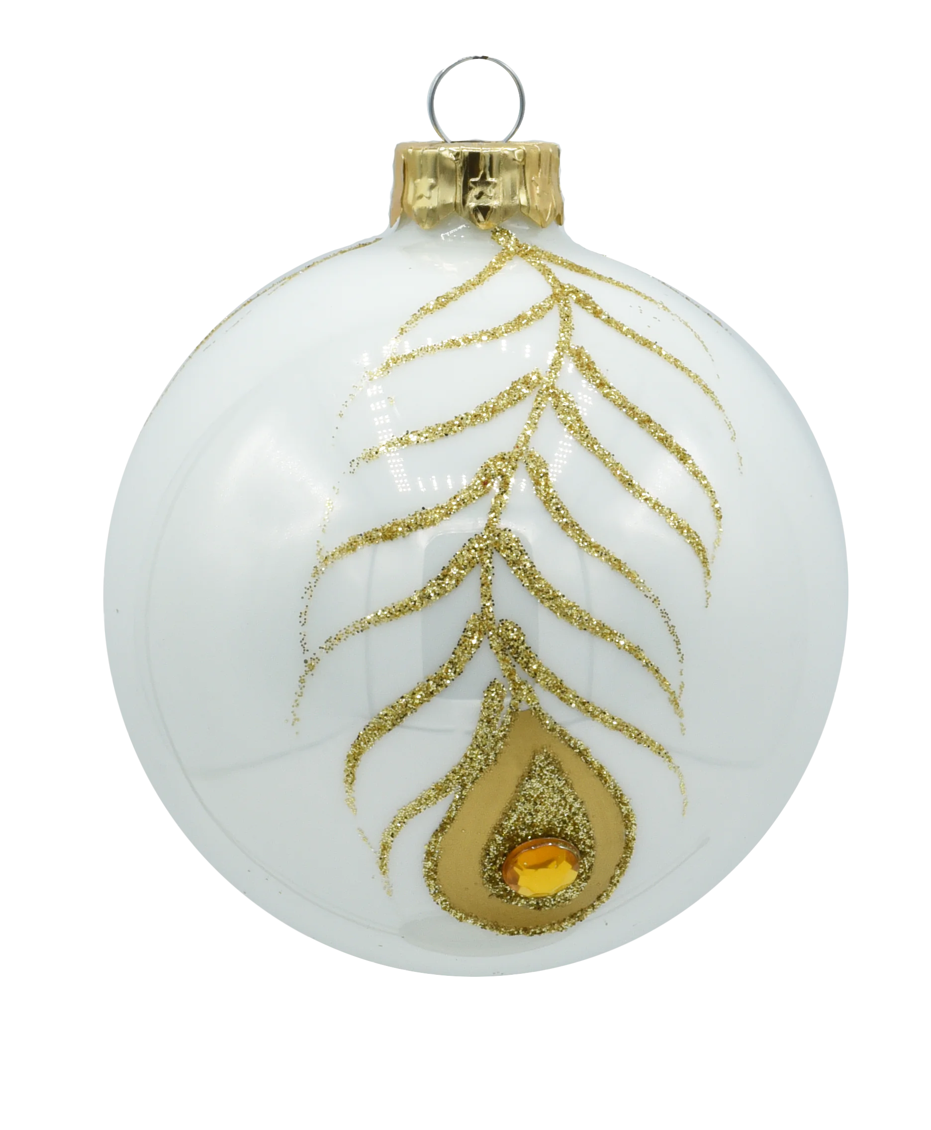 This elegant white glass bauble features a delicate golden feather motif and a warm amber accent at the base. Its simple yet luxurious design adds a touch of festive elegance to any Christmas arrangement.